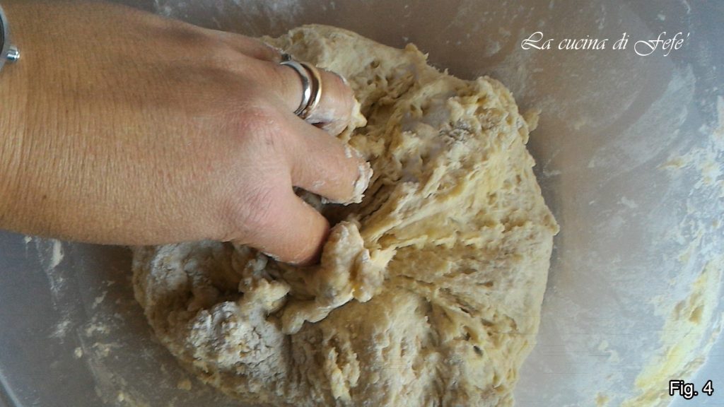 • Luego, cuando la masa se vuelva más consistente, proceda a trabajarla con las manos directamente en el cuenco (fig. 4).