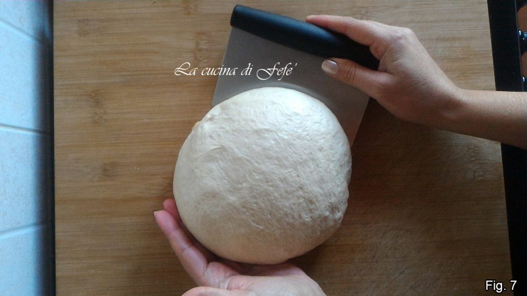 • Transcurrido este tiempo, desinfle la masa con los nudillos para liberar el aire en su interior, dé un giro de pliegues sobre sí misma en el cuenco, luego transfiérala a la superficie de trabajo y con la ayuda de una rasqueta, divídala en dos bollos iguales (fig. 7).