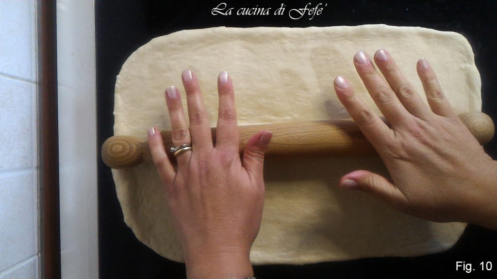 • Extienda el primer bollo en una superficie de trabajo bien enharinada con la ayuda de un rodillo hasta obtener una lámina rectangular de 40×27 (fig. 9).