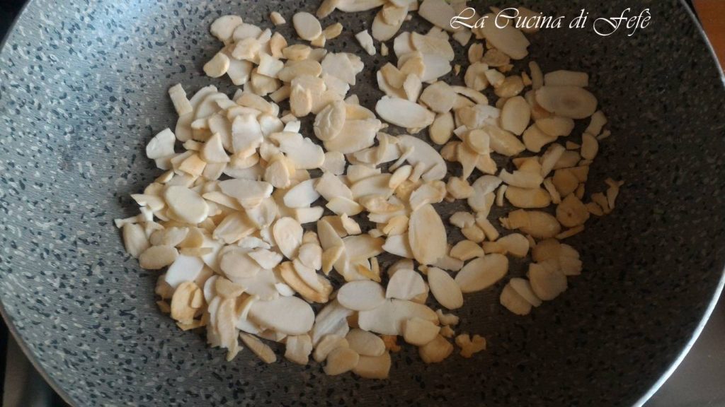 Mientras la tarta se enfría, en una sartén para crêpes, tuesta las almendras en láminas unos minutos a fuego mínimo, mezclando continuamente.