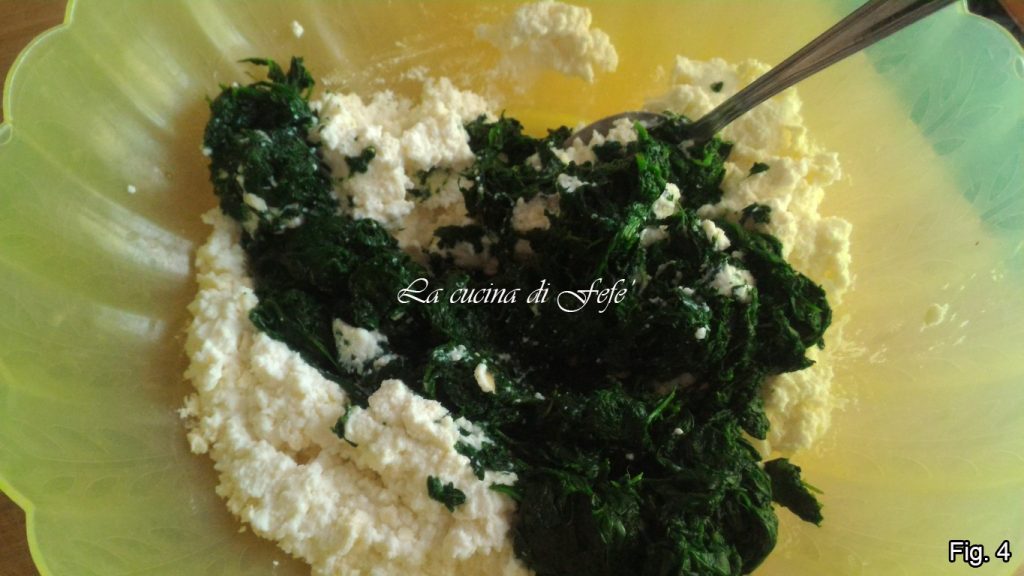 Añade también la feta desmenuzada y las espinacas picadas y mezcla bien los dos ingredientes (fig. 4).