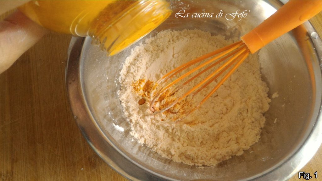 Empezad preparando con antelación la falsa crema diplomática para que esté ya fría cuando la utilicéis. En un cuenco, tamizad el almidón de maíz y mezcladlo con la cúrcuma con la ayuda de un batidor de mano o una cuchara de madera.