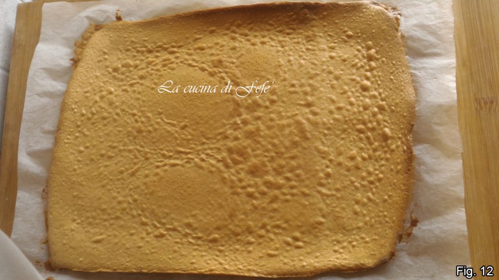 Una vez lista la mezcla, vertedla sobre una bandeja forrada con papel vegetal y niveladla con ayuda de una espátula en una capa de 7-8 mm. Si la capa es demasiado fina se quemará; si es demasiado alta, quedará como un bizcocho clásico y perderá elasticidad.