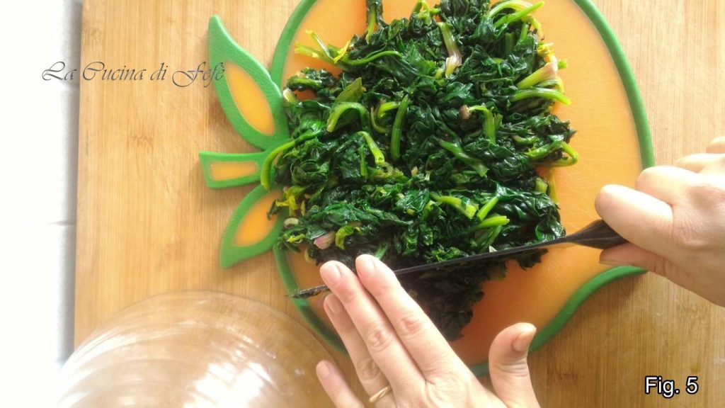 Después de lavar bien las espinacas, pásalas a una sartén con un chorrito de aceite y su propio jugo, y deja que se pochen a fuego suave, con tapa, 5′.