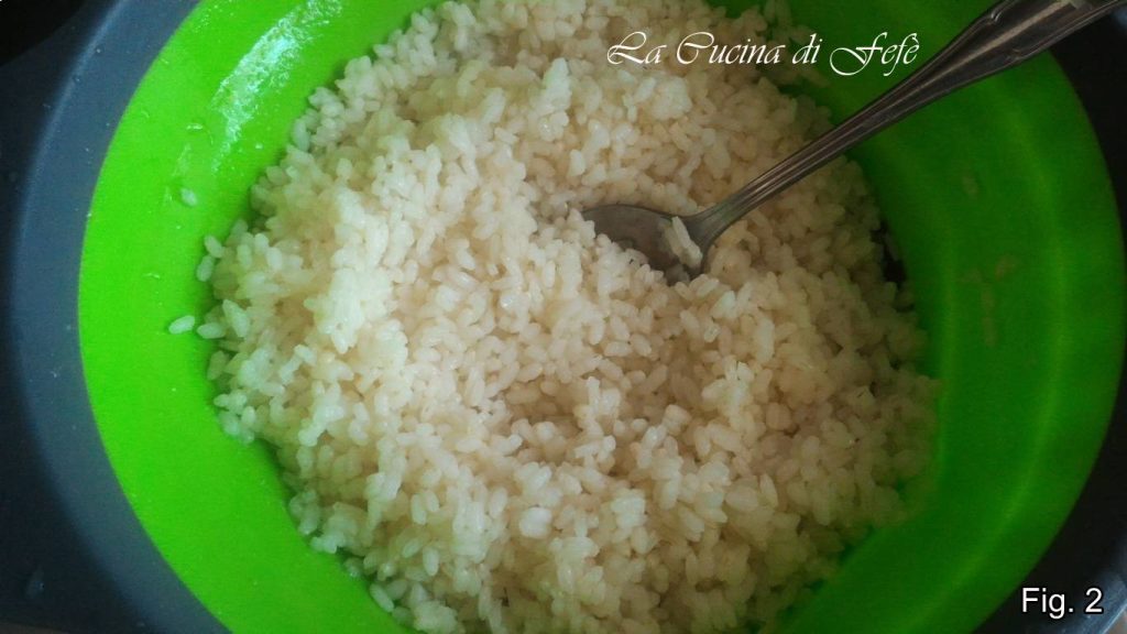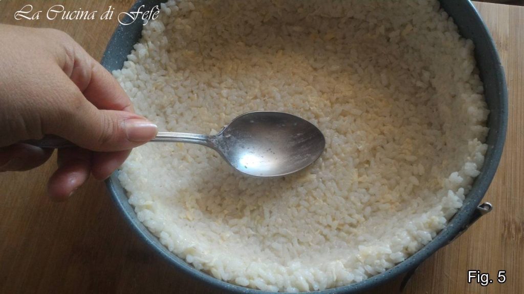 Forra el fondo de un molde desmontable antiadherente de 22 Ø con un disco de papel de horno y engrasa bien los bordes. Vierte el arroz y, con la ayuda de una cuchara, distribuye la mezcla sobre el fondo y a lo largo de las paredes del molde, compactando bien y de forma homogénea. Lleva al horno a 180°C durante unos 20′.