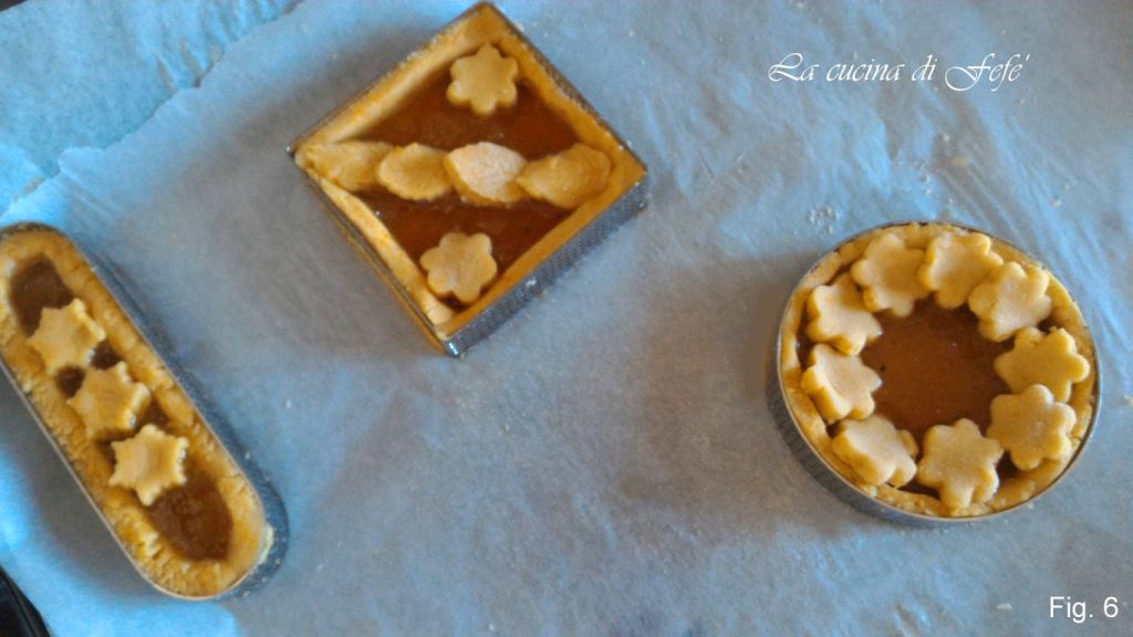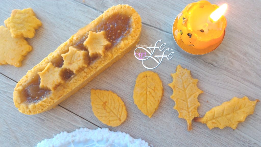 ¡Y aquí está una idea simpática para utilizar la masa de quebrada de calabaza que os propuse hace unos días! Yo las preparé para celebrar discretamente la fiesta de Halloween, que aunque no me encanta, participo solo por el espíritu festivo. Vosotros, en cambio, podréis prepararlas en cualquier otra ocasión, porque son perfectas para la merienda, para el desayuno y, dadas las dimensiones, también como dulces de cumpleaños. Se trata precisamente de tartaletas de masa quebrada de calabaza con un corazón de mermelada de higos, última reserva de mis provisiones hechas en casa. La combinación entre estos dos sabores es realmente sorprendente, sin duda una combinación no trivial que conquistará a toda la familia. Pronto también publicaré las galletas que preparé con lo que sobró de la masa quebrada, otra idea simpática para decorar tartas, copas de helado o incluso disfrutarlas simplemente con té. La receta está basada en harina de arroz, por lo tanto perfecta también para quienes son intolerantes al gluten. Podréis de todas formas variarla con otras harinas y rellenos más golosos a base de chocolate y así jugar con las combinaciones de sabores.