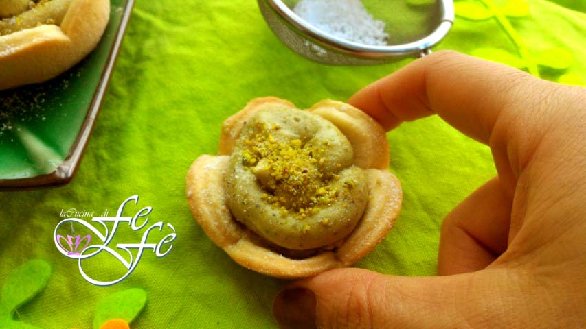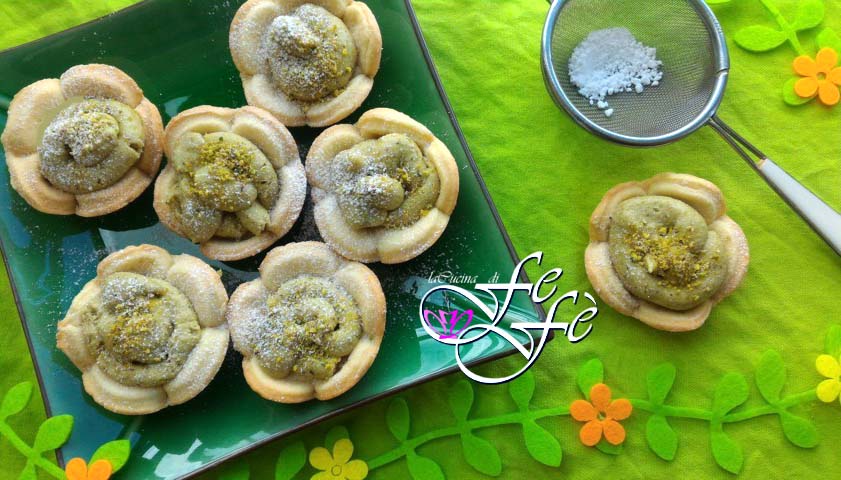 Nos acercamos al tan querido Día de la Madre, un día tan dulce como la persona a la que está dedicado. En realidad, como el Día de San Valentín, ¡pienso que también este se ha vuelto un poco comercial! Además, creo que todos los días deberíamos celebrar y mostrar a nuestras madres lo importantes que son en nuestra vida. Yo generalmente trato de estar más presente cuando entiendo que eso puede serle de consuelo, o le llevo algo preparado por mí, obviamente dulce, ¡siendo muy golosa! Por lo tanto, ¡estas tartaletas con una base de masa quebrada y un generoso relleno de pistacho de Bronte son la mejor manera de conquistarlas! Facilísimas de realizar, estas pequeñas y deliciosas joyitas son el mimo adecuado que nunca debe faltar a quien queremos. Deseo por tanto a mi madre que pueda siempre sonreír y hago el mismo sincero deseo a todas las demás, porque no hay regalo más grande que verlas felices.