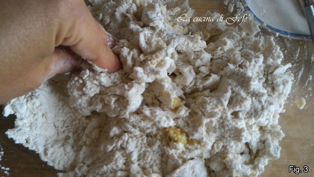 Luego, el aceite y finalmente la leche en hilo. Comienza a amasar, primero en el tazón y luego en una superficie de trabajo (fig. 3).