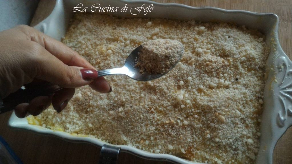 Cubre todo con 2-3 cucharadas de pan rallado e introduce el timballo en el horno a 180°C durante 10′ cubierto con papel de horno, luego descubre y prosigue la cocción durante otros 15′, accionando el grill los últimos 5′ a 200°C.