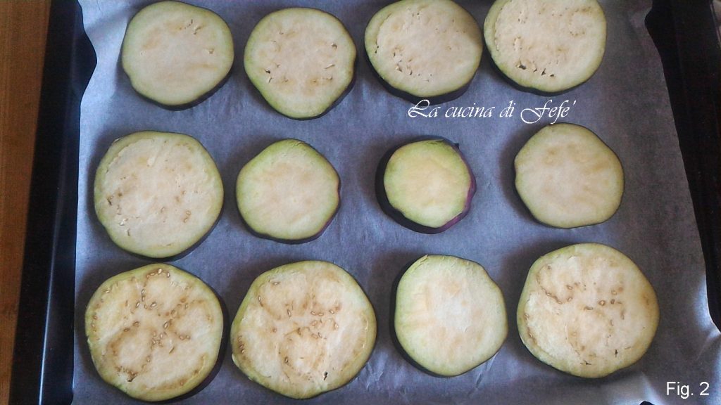 • Transfiere y coloca las rodajas de berenjenas en una bandeja cubierta con papel de horno (fig. 2).