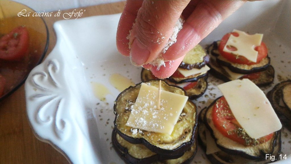 • Completa con un chorrito de aceite y espolvorea las torres así compuestas con queso parmesano rallado (fig. 14).