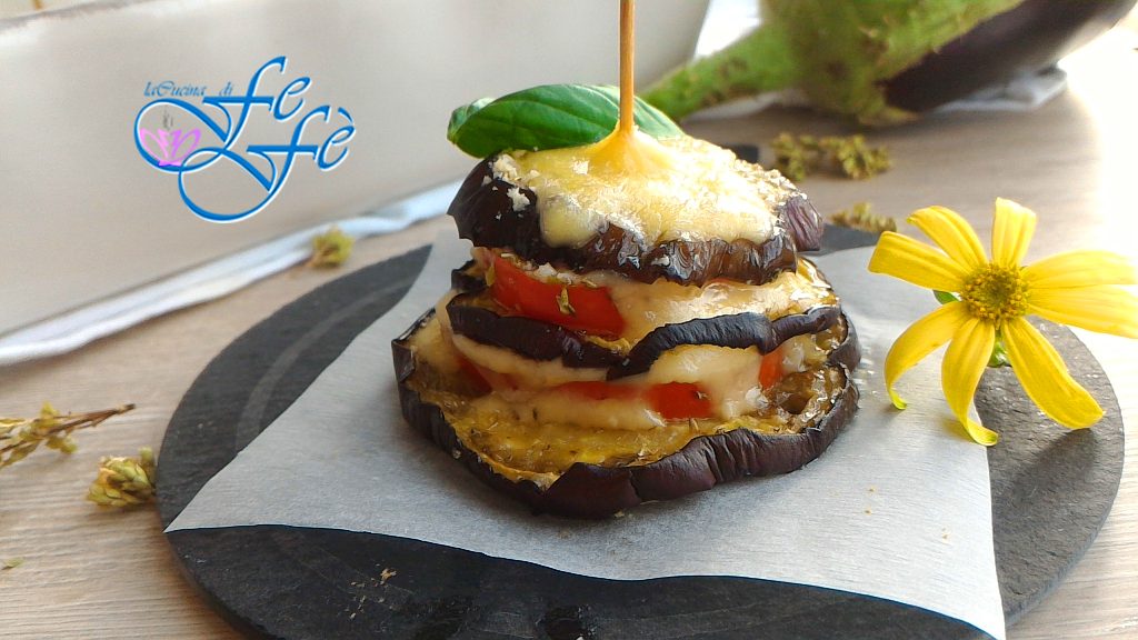 Hay días en los que la creatividad falta, especialmente cuando tienes prisa y quieres preparar algo rápido pero al mismo tiempo sabroso y vistoso para llevar a la mesa. A veces, buscando aquí y allá en la web, encuentro inspiración, para luego expresar mi creatividad con pequeñas modificaciones en las cantidades o en la forma de preparación durante los distintos pasos. ¡Esta receta de torres de berenjenas es una de esas que hace años capturó inmediatamente mi atención! Sin embargo, en comparación con la receta original, preferí añadir una capa más, aprovechando también las rodajas más pequeñas de berenjena, que generalmente se descartan. Ya me conocéis, no me gustan los desperdicios alimenticios y en mi casa ¡no se tira nada! Aprovechando, por lo tanto, la necesidad de renovar las fotos en el blog, porque las anteriores eran realmente inaceptables, las propuse nuevamente con gusto para la cena de esta noche. ¿Qué puedo decir? ¡Ligerísimas y al mismo tiempo deliciosas! Aliñadas simplemente con aceite, sal y orégano, se transforman en delicias gustativas gracias a ese toque de queso emmental fundente que se derrite perfectamente durante la cocción. Así se prestan a convertirse en un aperitivo tipo finger food realmente atractivo y vistoso, ¡pero también en un perfecto segundo plato completamente vegetariano!