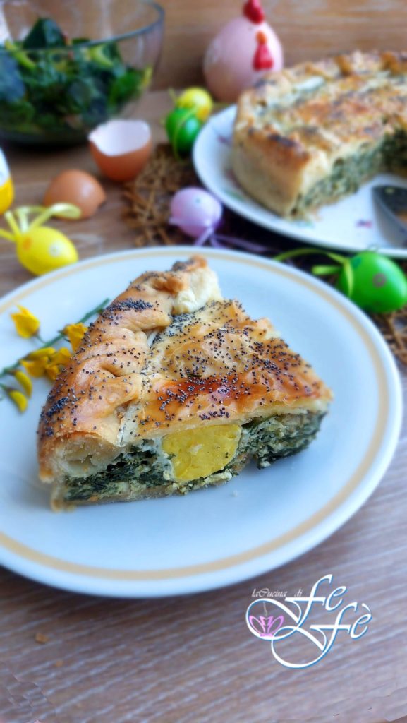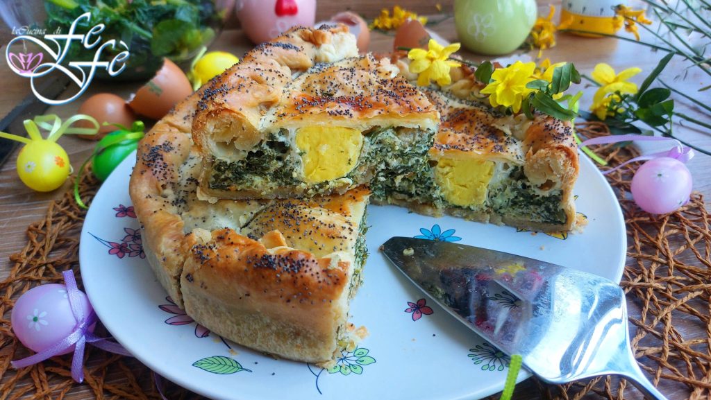 Este año para la mesa de Pascua, quise probar una receta ligur muy sabrosa y escénica, la torta pasqualina, o como la llaman en Génova, torta pasqualinn-a! Se trata de una tarta salada rústica hecha con una doble capa de masa quebrada o solo hojaldre. En mi caso, sin embargo, decidí variarla ligeramente, utilizando en la base mi masa quebrada al aceite, mientras que para la cobertura de la tarta, confié en un disco de hojaldre ya preparado. Debo decir que la elección de usar dos tipos diferentes de masa fue realmente acertada, dado los elogios de familiares y amigos. La torta pasqualina, además, tiene un relleno delicioso a base de espinacas o acelgas, hierbas y huevos. La receta original requeriría la prescinseua, un queso fresco genovés con un sabor ligeramente ácido, pero dado que es un producto difícil de encontrar fuera del territorio ligur, lo reemplacé con ricotta. Sin embargo, su característica es el efecto sorpresa al momento de cortar las porciones. De hecho, dependiendo del tamaño del molde, se añaden al interior de la crema de ricotta y espinacas entre dos y cinco huevos enteros, estrictamente crudos, de modo que, una vez cocidos, sus yemas y claras se solidifican. Esto hará que cada porción de la tarta sea una verdadera sorpresa visual y todos querrán cortarla para descubrir sus lados ocultos. Les diré, es tan buena, que ciertamente el periodo de Pascua es el mejor momento para disfrutarla, pero también en Pascueta o en las primeras excursiones durante la temporada bonita, será igualmente perfecta.