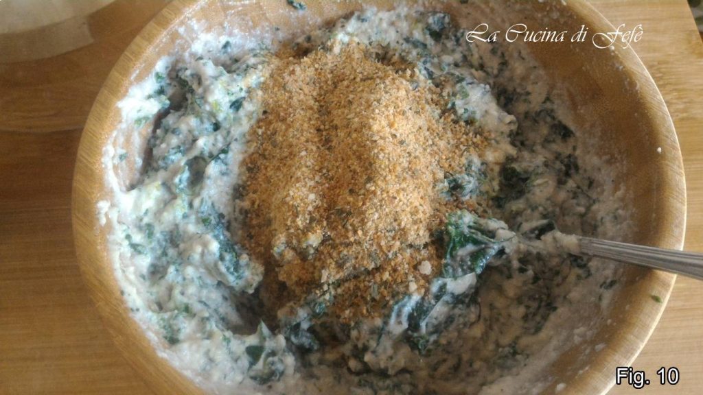 Unid también la ricotta previamente escurrida y la nuez moscada, y continuad mezclando (fig. 8). Unid al compuesto también las espinacas picadas y mezclad homogéneamente (fig. 9).