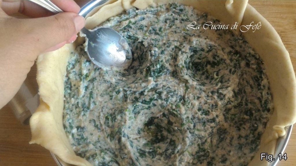 Colocadlo en un molde desmontable de 24 Ø, forrado con papel de horno, espolvoread con una pizca de pan rallado y distribuid encima el relleno de ricotta y espinacas (fig. 12 y 13).