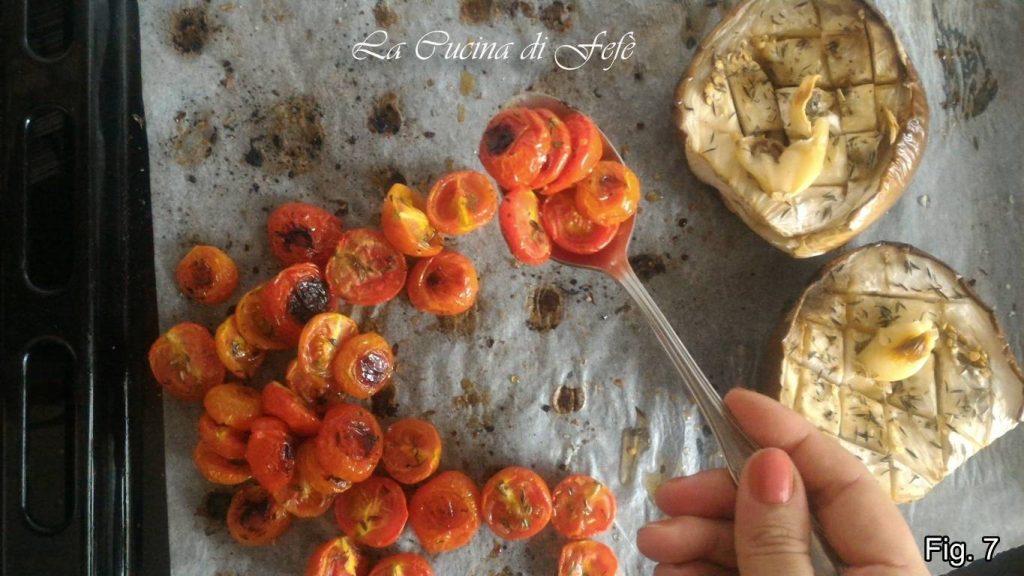 Rociad con un generoso chorro de aceite de oliva virgen extra, añadid los dientes de ajo sin pelar* y metedlo en el horno a 190°C durante aproximadamente 20-25′ , luego sacad los tomatitos seguramente ya cocidos con una cuchara, volved a meter las berenjenas en el horno y proseguid la cocción durante otros 15′ . La pulpa de estas últimas deberá estar blanda y los dientes de un tenedor penetrar fácilmente**.