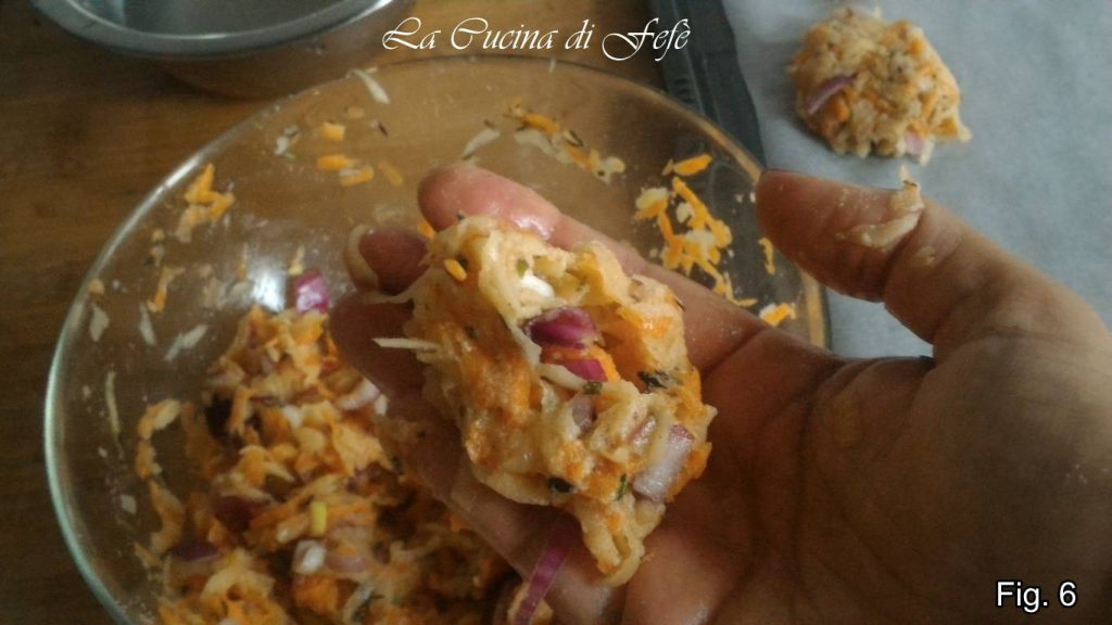 Escurrid tanto las patatas como las zanahorias ralladas con las manos dentro de un cuenco para permitir que salga su agua de vegetación (fig. 2). Trasladadlas a un bol grande junto con los huevos, la cebolla picada y una pizca de sal y pimienta al gusto (fig. 3).