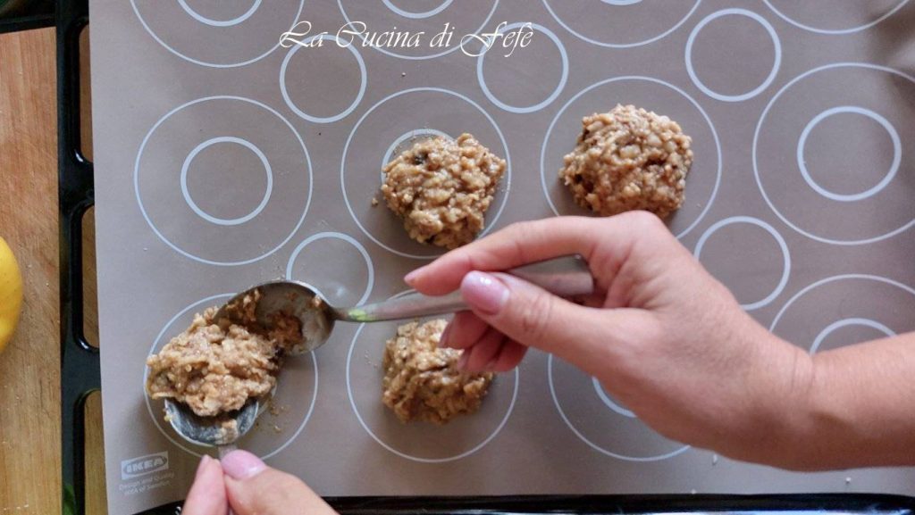 Ahora, con la ayuda de 2 cucharas ligeramente húmedas, toma pequeñas porciones de 35-40 g como máximo y forma tortitas que irás colocando poco a poco sobre una bandeja forrada con papel de horno o con un tapete de silicona como hice yo.