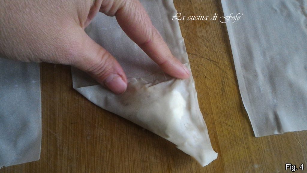 Continúa doblando la pasta filo llevando inmediatamente después el ángulo derecho a tocar el borde izquierdo de la tira (fig. 5).