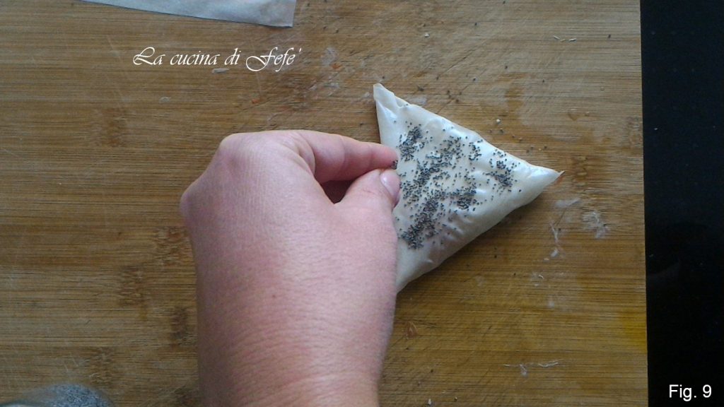 Pincela la superficie de los triangulitos así obtenidos con poco aceite y espolvorea con semillas de amapola (fig. 9).
