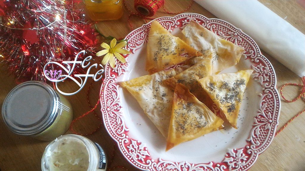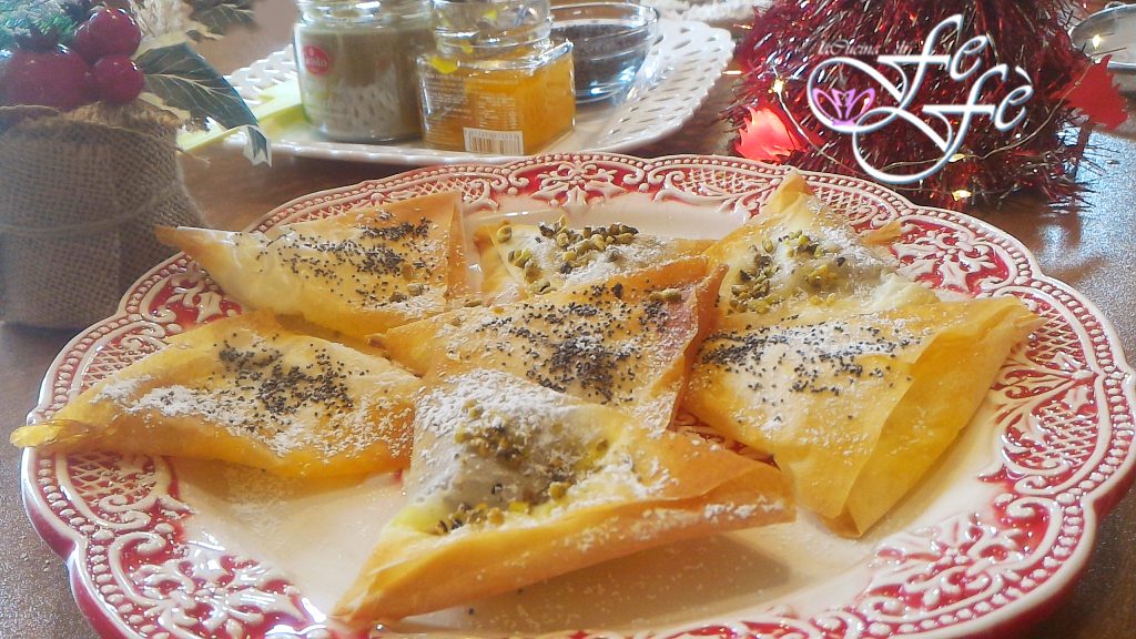 ¿Buscas un postre para las fiestas de Navidad, poco laborioso pero superescénico y original? ¡Los triángulos de pasta filo son justo lo que necesitas! Se preparan en pocos minutos y causarás sensación porque son una verdadera tentación en cada bocado. La crujiente corteza envuelve un relleno suave y delicioso, con una doble textura, la ligeramente ácida de la mermelada de mandarinas y la envolvente del mascarpone y yogur. Todo ello embellecido con dulces y preciosas bolitas aromáticas y perfumadas dadas por las semillas de amapola. La elección de mis mermeladas y confituras, por una obvia pertenencia territorial, está confiada a algunas empresas sicilianas que se ocupan de productos y materias primas de excelencia. Dada la calidad, ¡el resultado ha sido realmente excelente! Aquí en casa se devoraron en un santiamén como postre de fin de comida acompañados de un café o un buen licor. Además, con la pasta filo puedes realmente dejar volar la imaginación y hacer una infinidad de variantes todas para experimentar.
