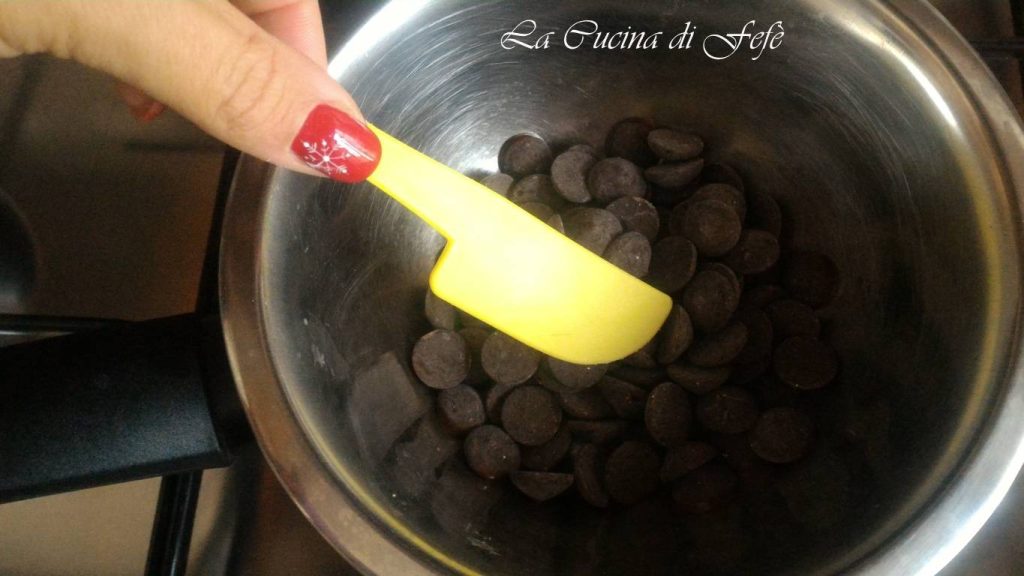 Mientras tanto, rompe el chocolate negro en un bol (yo usé directamente los prácticos botones de chocolate) y fúndelo al baño María en una cacerola.