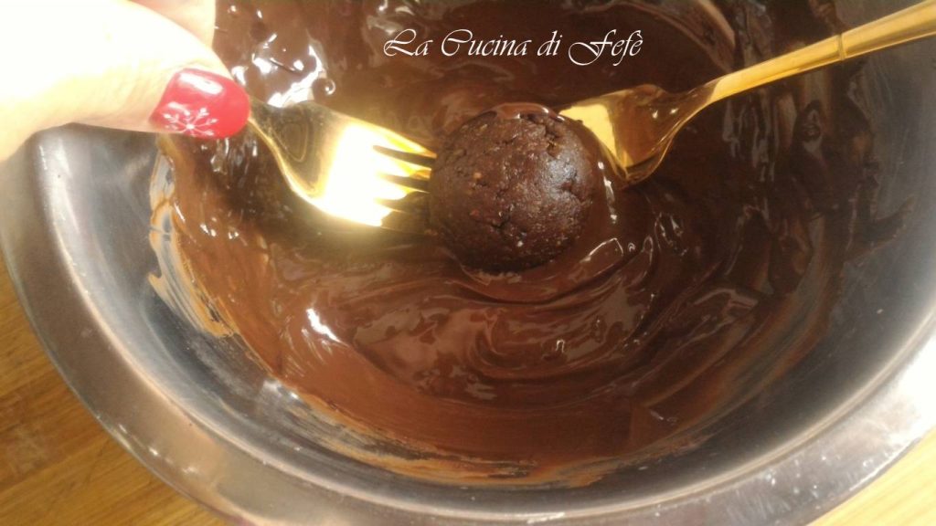 Sumerge muy rápidamente las trufas ya frías hasta cubrirlas completamente, luego retíralas con la ayuda de 2 tenedores, dejando caer el exceso de chocolate.