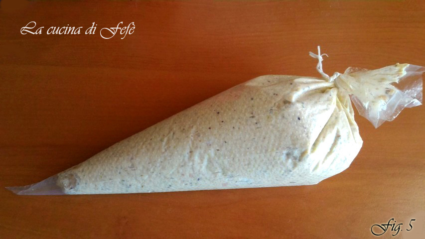 Cocina en horno caliente a 200º C durante unos 15′ o hasta que estén inflados y dorados en la superficie. Déjalos enfriar fuera del horno. Mientras tanto, prepara el relleno: corta la mortadela en cubitos, asegurándote de dejar algunos de lado para la decoración final y colócala en una batidora o robot de cocina junto con la ricotta fresca y las 2 cucharadas de leche.