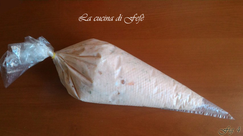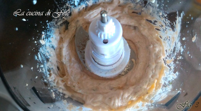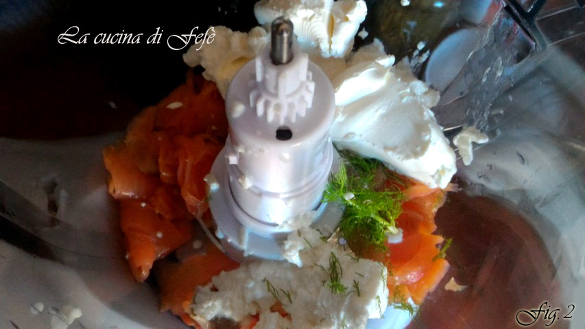 Cocina en el horno caliente a 200º C durante unos 15′ o hasta que estén inflados y dorados en la superficie. Saca los vol-au-vent del horno y déjalos enfriar completamente fuera del horno. Prepara mientras tanto la mousse para el relleno, colocando en una batidora el salmón cortado en tiras, reservando algunas para decorar, el queso crema y el eneldo.