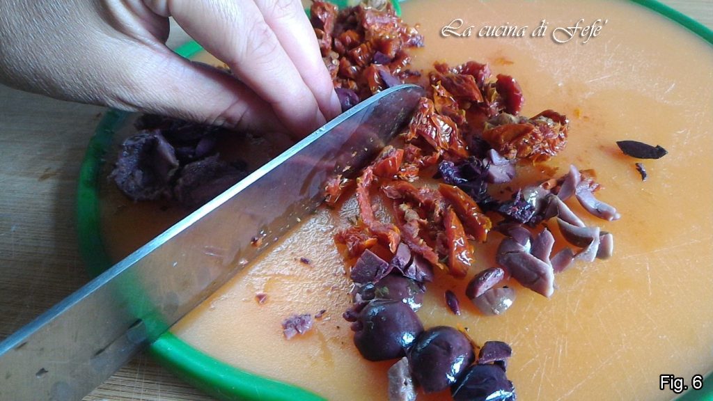 • Mientras tanto, escurre bien los tomates secos, sécalos con papel absorbente de cocina y córtalos finamente junto con las aceitunas sin hueso.