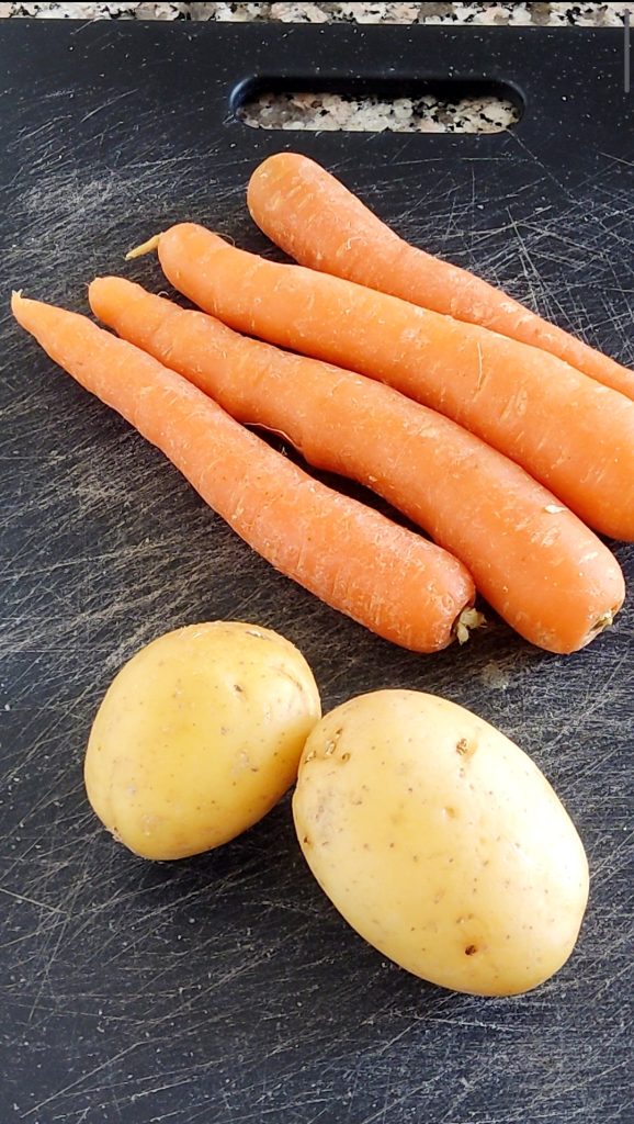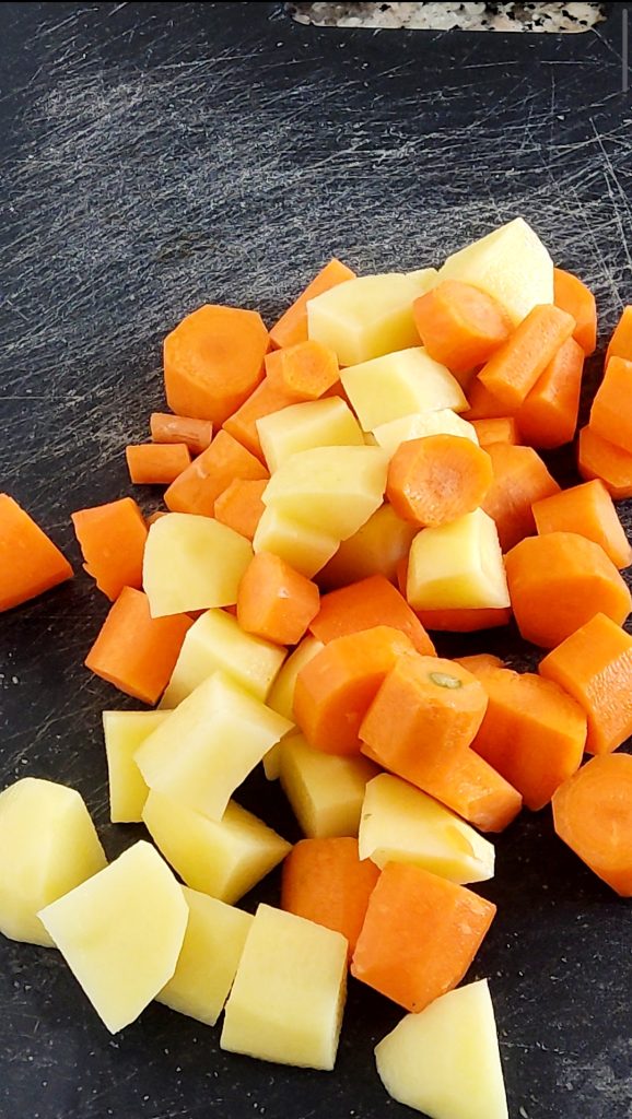 • Pela las patatas y las zanahorias. Lávalas y córtalas en trozos pequeños