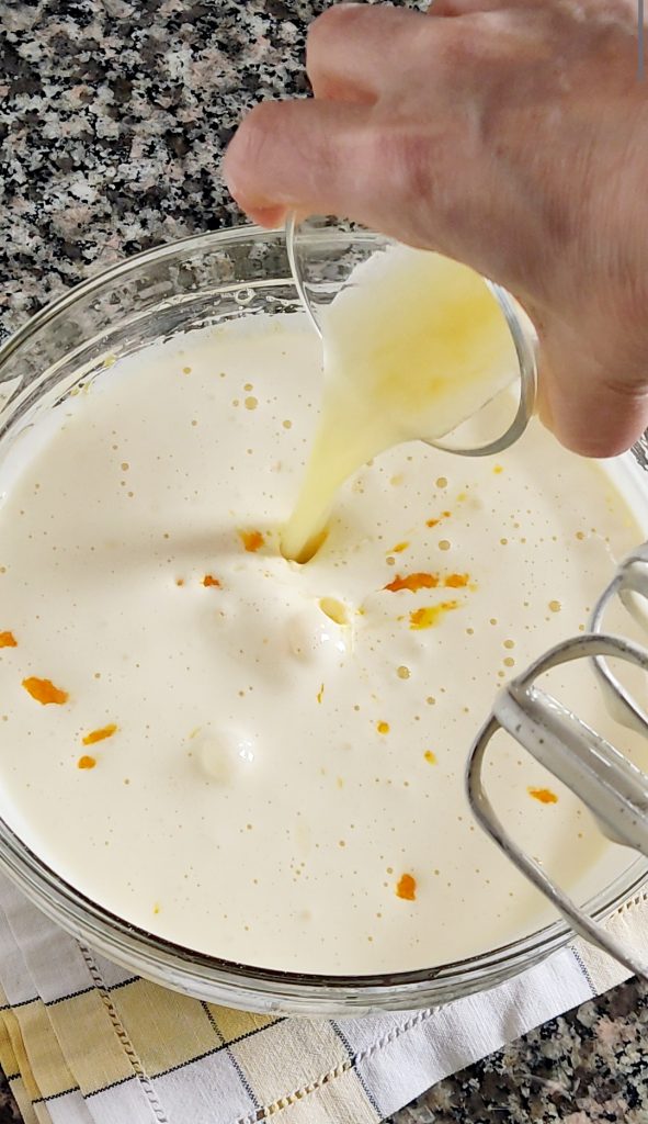 Se formará una deliciosa crema naranja. Monten en un bol los huevos con el azúcar con la ayuda de una batidora eléctrica durante 6-7 minutos hasta obtener una mezcla clara y espumosa.