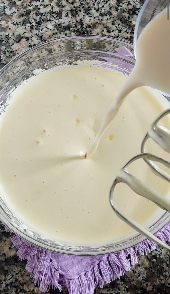 Bate bien los huevos con el azúcar hasta obtener una mezcla clara y espumosa y no mezcles en exceso después de añadir la harina