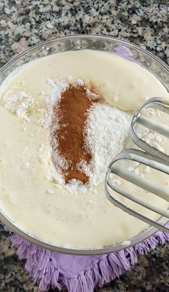 Añade ahora la harina tamizada, la levadura para repostería y la canela en polvo. Mezcla