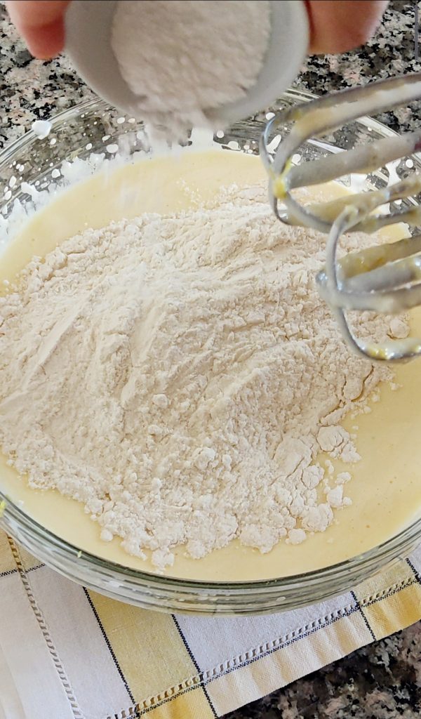 Termina la preparación añadiendo la harina tamizada y la levadura para repostería. Mezcla.