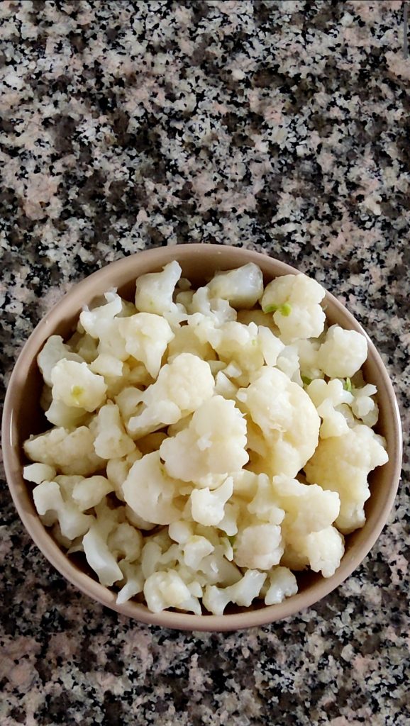 Limpiad la coliflor eliminando las hojas exteriores y el tallo. Luego divididla en pequeños ramilletes. Lavadla bajo el agua corriente. Cocinad la coliflor sumergiéndola en agua hirviendo con sal durante unos 10-12 minutos. Os recomiendo comprobar la cocción pinchándola con los dientes de un tenedor. Escurridla y dejadla enfriar.