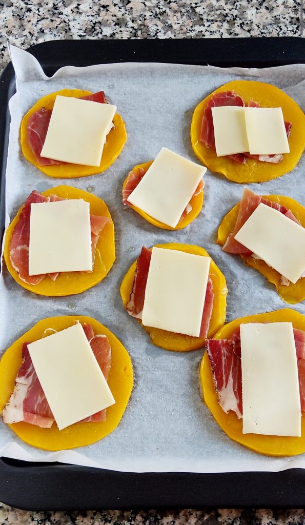 Deja el horno encendido y saca la calabaza. Coloca en cada rodaja de calabaza 2 lonchas de speck y una rodaja de queso.