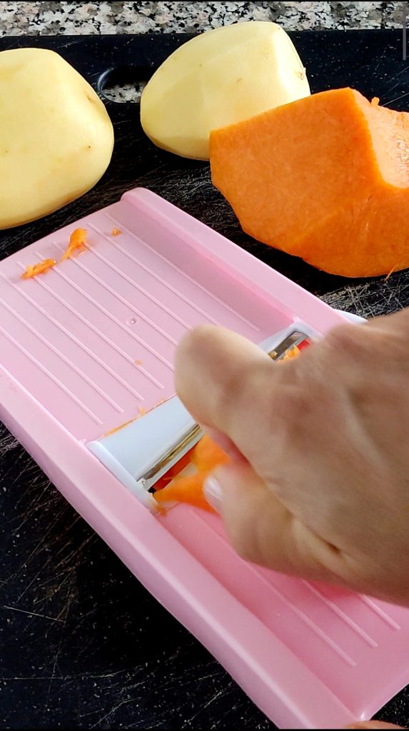 Limpia la calabaza eliminando la cáscara, las semillas y los filamentos internos. Pela las patatas. Con ayuda de una mandolina, corta en rodajas finísimas tanto la calabaza como las patatas.