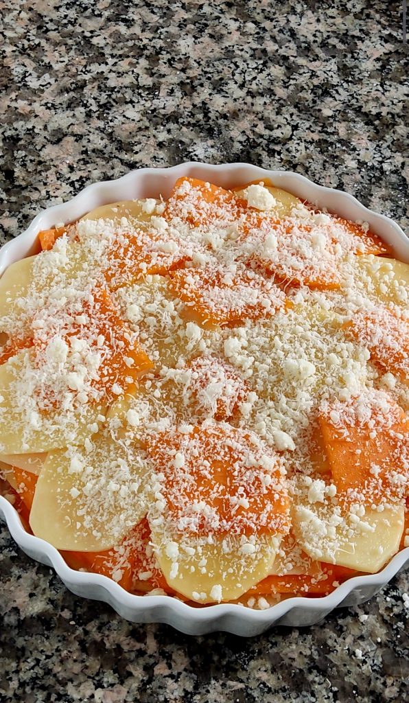 Termina con rodajas de patatas y calabaza. Un poco de sal, una generosa espolvoreada de queso parmesano rallado y un hilo de aceite virgen extra.
