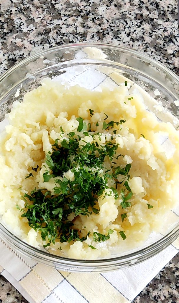 Con la ayuda de un prensapatatas, reduce las patatas a puré. Añade una pizca de sal, el perejil picado y la fécula de patata. Según la receta tradicional, también lleva menta, pero a mí no me gusta, así que he preferido no añadirla.