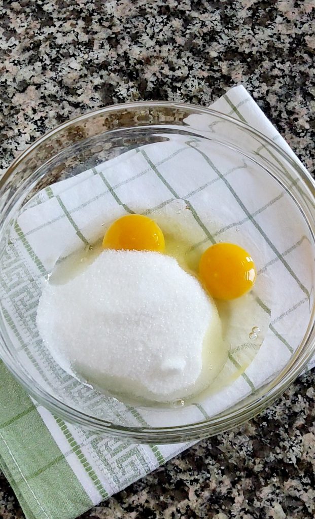 Montad los 2 huevos enteros con el azúcar con la ayuda de una batidora eléctrica durante 7-8 minutos, hasta obtener una mezcla clara y espumosa.