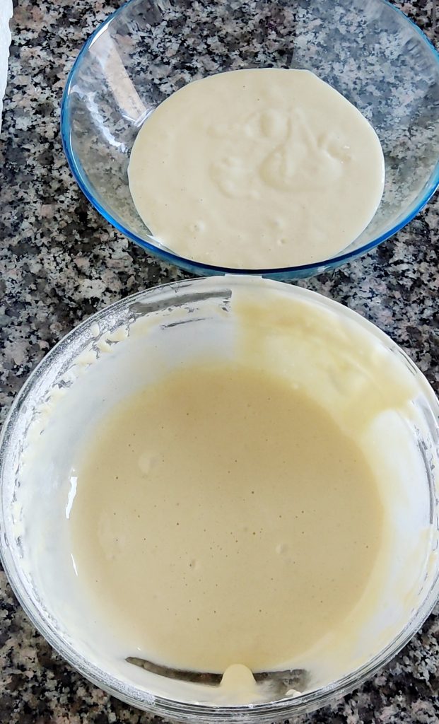 Transferid la mitad de la mezcla a otro bol. Ahora tendréis 2 boles más o menos con la misma cantidad de mezcla, no importa ser exactos.