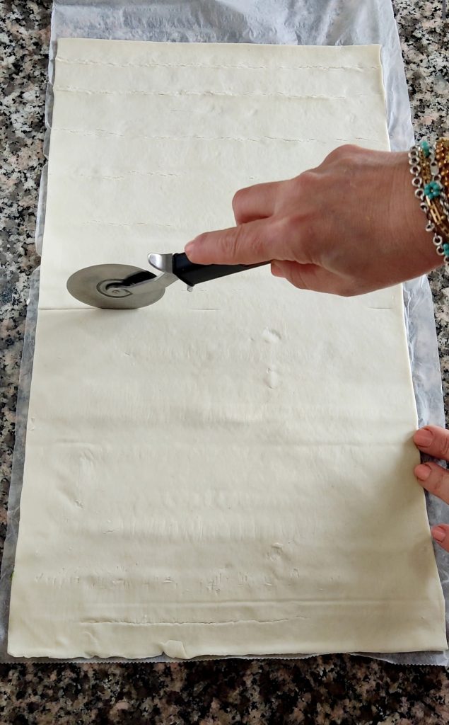 Extiende el rollo de hojaldre rectangular sobre la superficie de trabajo y divídelo en 2 partes a lo largo.
