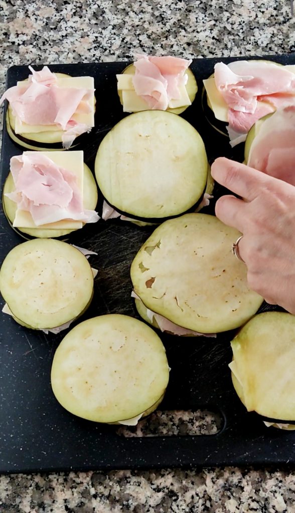 Rellena la mitad de las rodajas de berenjena con una loncha de queso y una loncha de jamón cocido.
