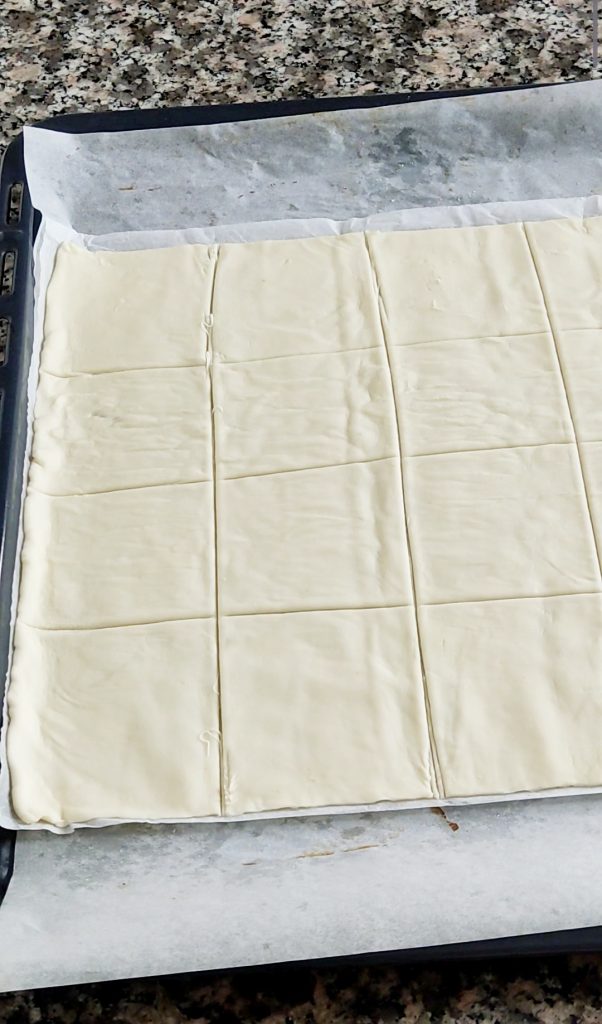 Extiende un rollo de masa de hojaldre rectangular sobre la superficie de trabajo y divídelo en rectángulos. A mí me salieron 12 rectángulos.