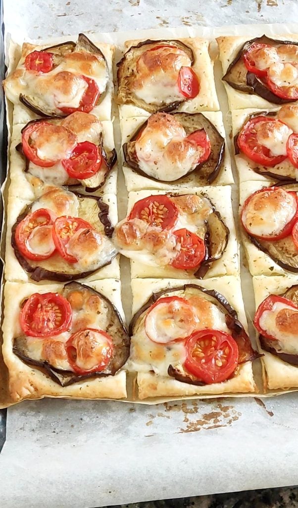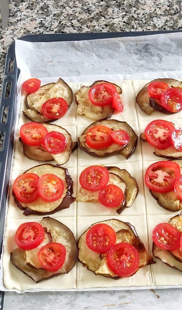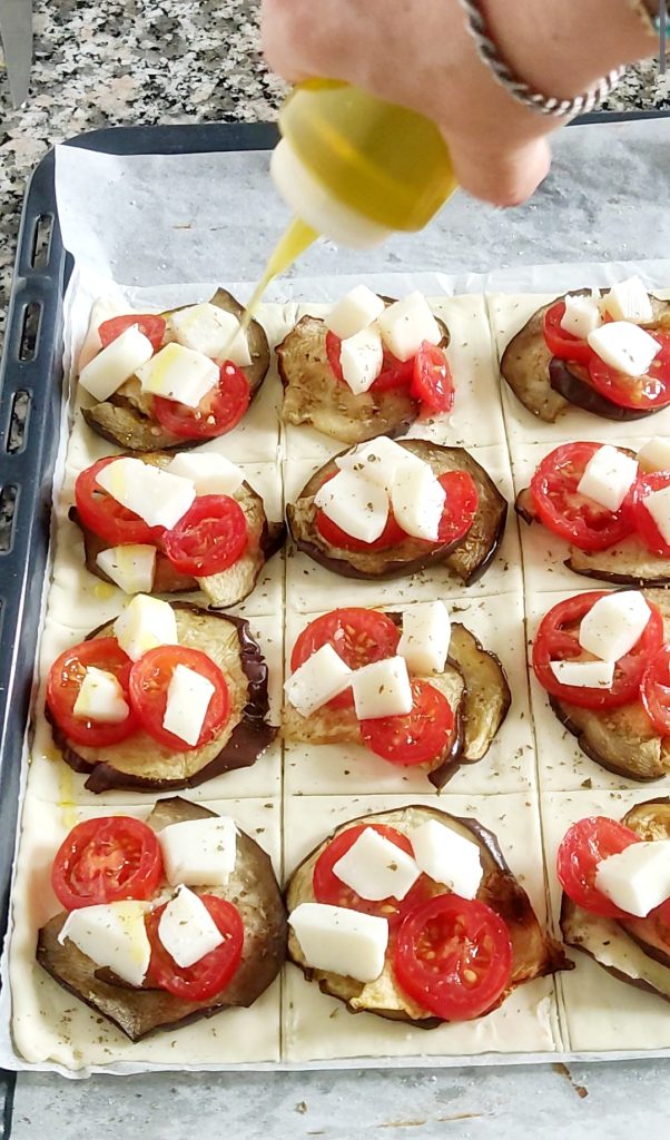 Hojaldrinas con berenjenas sencillas, deliciosas y buenísimas. Las recetas simples y rápidas a menudo son también las más ricas, justo como la receta que quiero contaros hoy. Solo unos pocos ingredientes y voilà podéis preparar unas irresistibles Hojaldrinas con berenjenas y tomatitos muy sencillas y buenísimas. Las berenjenas son una verdura de verano perfecta para preparar mil y más recetas, desde la clásica Parmigiana de berenjenas hasta deliciosos Involtinis de berenjenas o una especial Pasta al horno con berenjenas. Un rollo de masa de hojaldre que nunca debe faltar en el frigorífico, berenjenas a la parrilla, tomatitos y mozzarella. Una receta simple a prueba incluso de los más torpes en la cocina que estoy segura conquistará a vuestra familia como ha conquistado a la mía. Vamos entonces a la cocina y preparemos juntas unas fantásticas Hojaldrinas de berenjenas y tomatitos