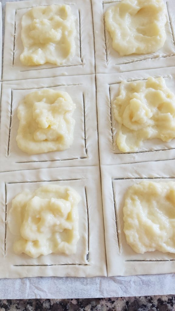 Extiende un rollo de hojaldre rectangular sobre la superficie de trabajo y divídelo en varios cuadrados, a mí me salieron 12. Con un cuchillo incide un marco en cada cuadrado de hojaldre dejando intactas 2 esquinas opuestas. Te será muy fácil observando las fotos