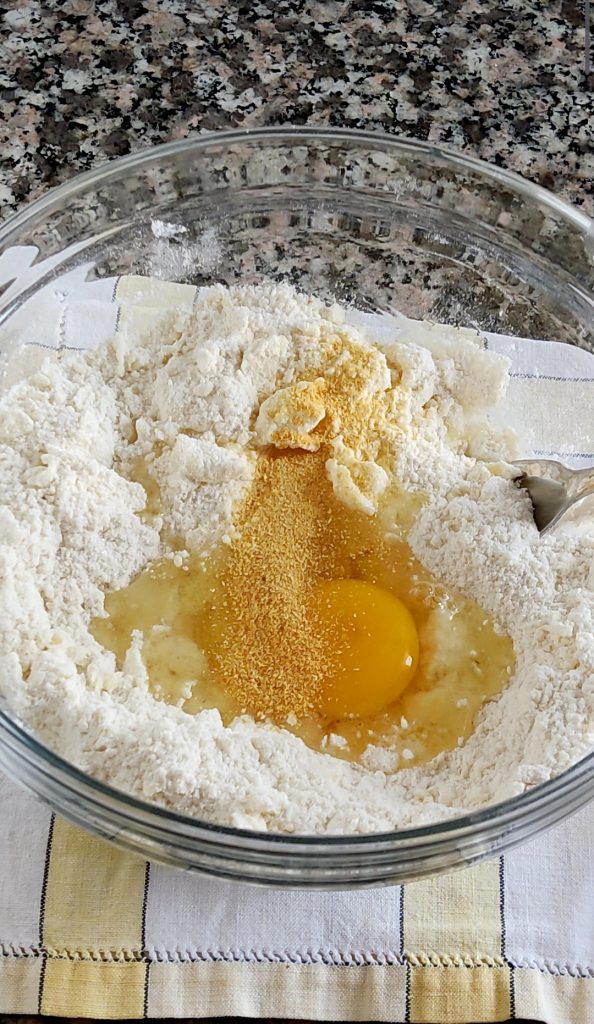 Podéis preparar la masa quebrada a mano o con una batidora. Verted la harina en un bol. Añadid la mantequilla en cubos, el azúcar, un huevo y la cáscara de medio limón rallada.