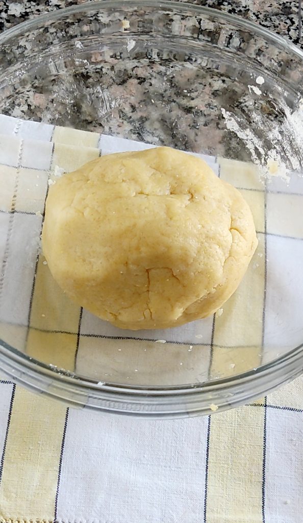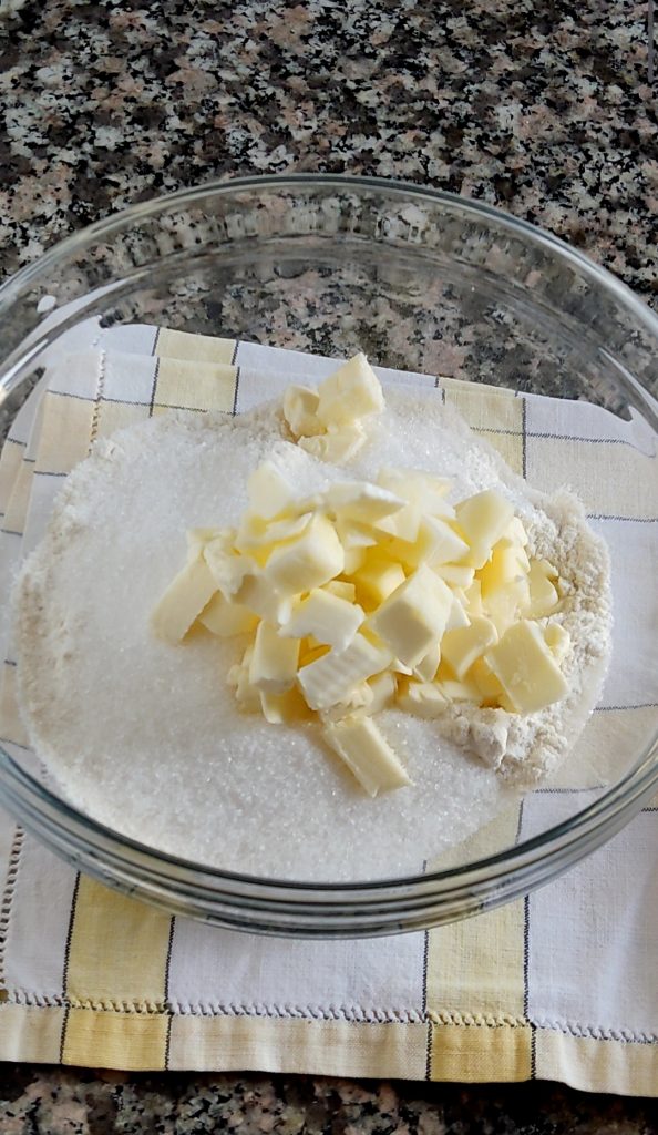 Primero prepara la masa quebrada, puedes hacerlo simplemente en un bol como hice yo o con la ayuda de una amasadora. Pon la harina en un bol. Añade la mantequilla en cubitos, el azúcar, un huevo y la cáscara de medio limón sin tratar rallada.