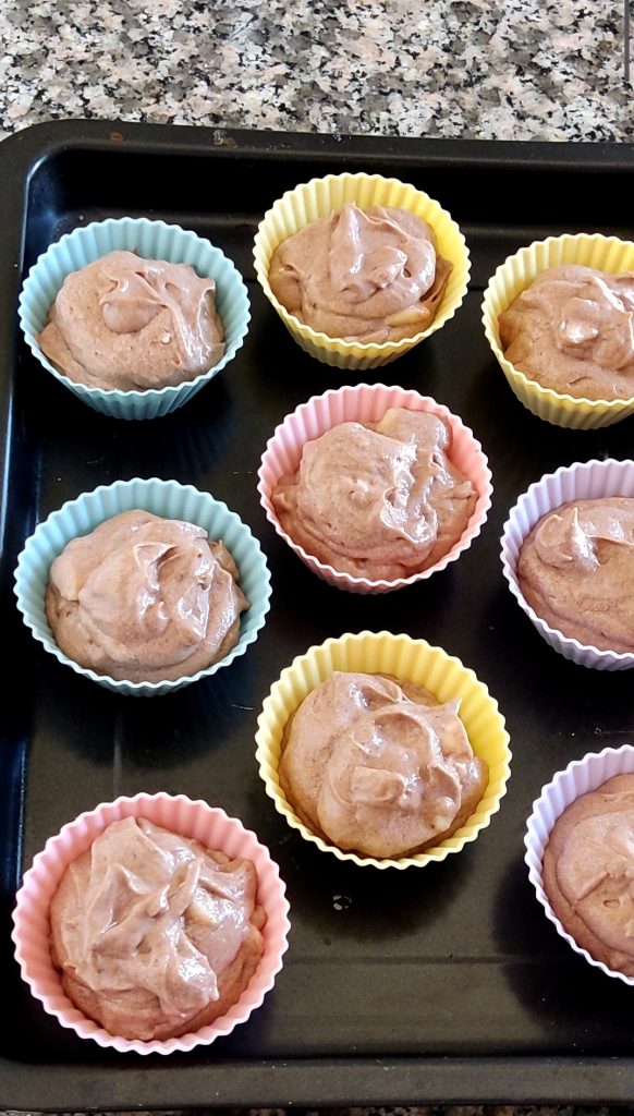 Por último, añade las peras en cubos y mezcla con una espátula para integrarlas en la masa. Llena 2/3 de los moldes de papel para muffins de silicona con la masa. A mí me salieron 9.